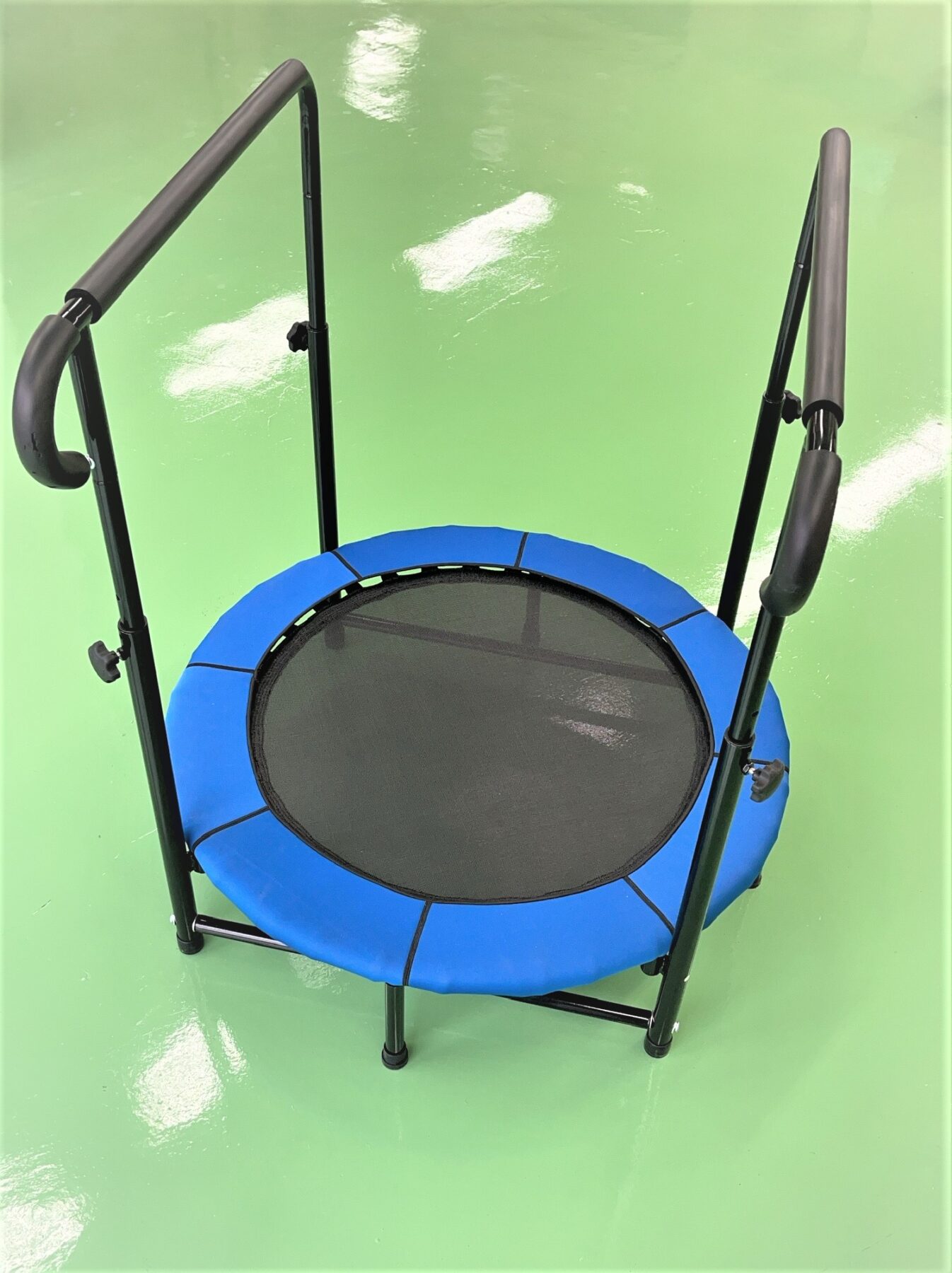 「にこっポリン」は高齢者向けのケアトランポリンで、25㎝の低設計や手すり、8本足つきの安全設計なので安心してお使いいただける自社商品のケアトランポリンです。手すりを持ったまま使用しますので安全に運動をお楽しみいただけます。低負担で高い運動効果が得られ、骨粗鬆症・骨折予防やストレス解消に効果的で、介護予防に最適です。